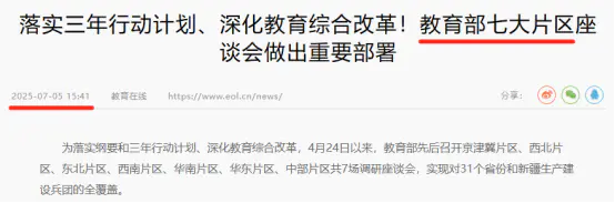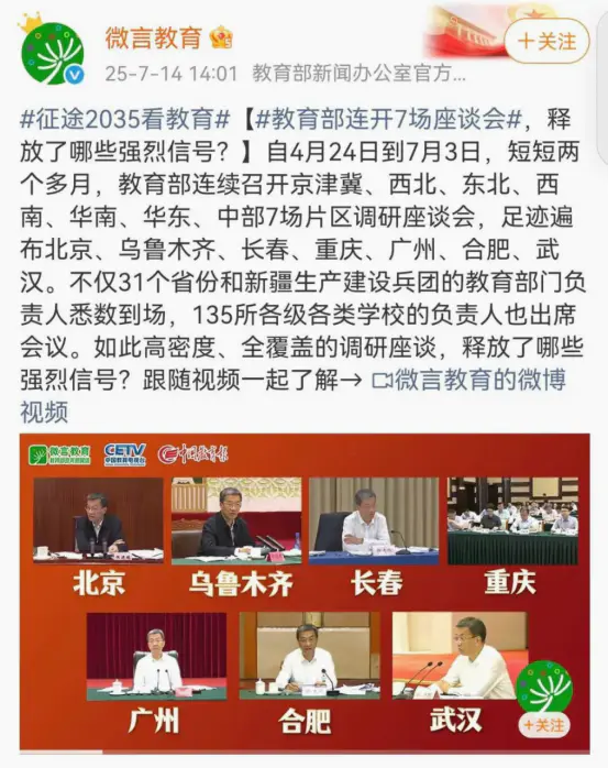 2025年4月至7月,教育部為落實(shí)《教育強(qiáng)國(guó)建設(shè)規(guī)劃綱要(2024—2035年)》及三年行動(dòng)計(jì)劃,先后召開了覆蓋京津冀、西北、東北、西南、華南、華東、中部七大區(qū)域的調(diào)研座談會(huì)。