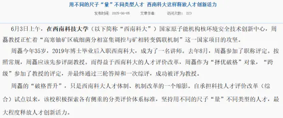 比如在西南科技大學(xué),青年教師若在針對(duì)服務(wù)國(guó)家和四川省戰(zhàn)略需求、取得重大技術(shù)突破等方面的科技人才以及優(yōu)秀青年教師等,有專門的“擇優(yōu)破格”“年限破格”等靈活的“破格晉升”機(jī)制。
